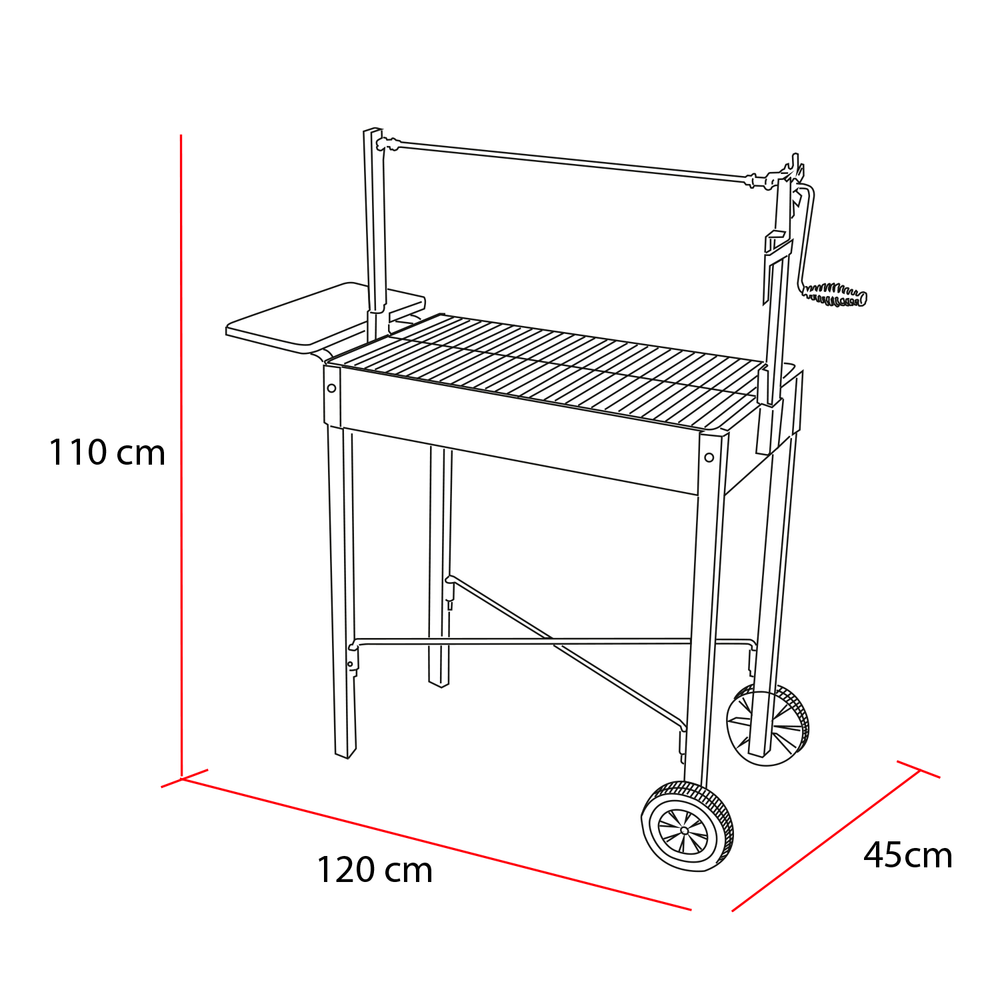 Incluye una roldana con cable de acero para ajustar la altura de la parrilla sin complicaciones y una tabla lateral de apoyo para tener todo a mano.